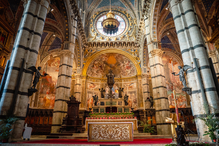 Расписанный божьей рукой, но под контролем Бальдассарре Перуцци, алтарь с бронзовыми канделябрами-ангелами. Выше круглый витраж апсиды, старейший в Италии. Тринадцатый век не много ни мало, и ещё пара бронзовых канделябров-ангелов на боковых полуколоннах, точно таких же, как у Натана Семёновича Голденблатта на даче в Переделкино.