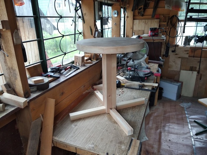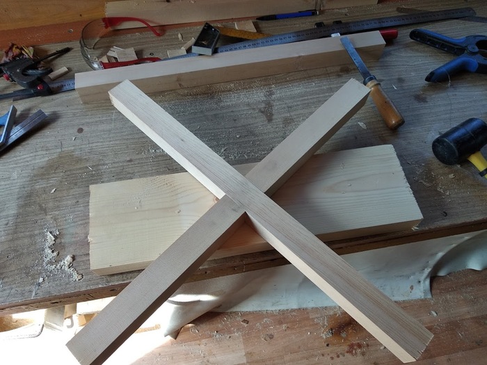 Ножка у стола делалась по старой схеме одна, только вместо 8 брусков, будет 4, потоньше получится. 4 бруска по 66 см и два под крестовину такой же длины.