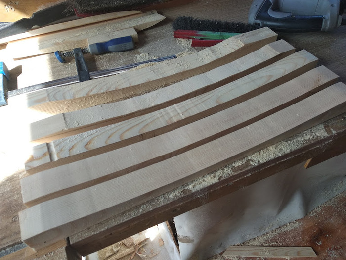 В самом тонком месте ламель будет толщиной 20 мм. Алгоритм такой: вставил ламель в шаблон, отчертил линию, далее грубо прохожу максимально близко к черте электролобзиком (ненавижу электролобзики) и дальше вложив заготовку обратно в шаблон, для верности по краям прихватив саморезами (в местах, которые в дальнешем будут удалены) обрабатываю ее на фрезерном столе. Примерно вот так оно и выглядит: первых две ламели после лобзика, третья брак, четвертая и пятая после фрезерования.
