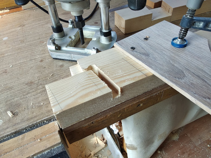 Спинка и сиденье будут собраны на соединение в полдерева. Простейший шаблон - упор из обрезков бруска и ламината поможет сохранить углы.