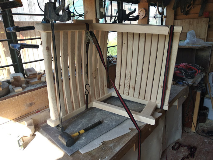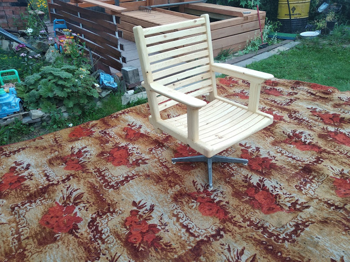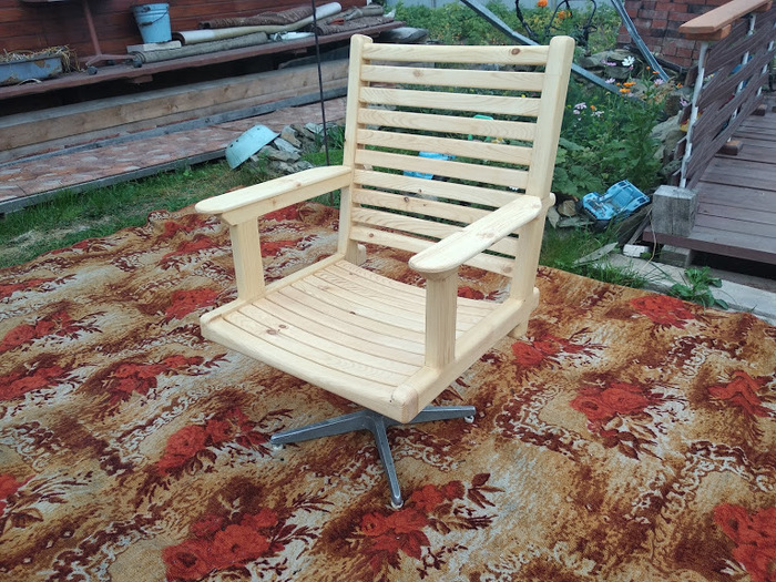 На фото не попало крепление кресла к ножке. Забыл сделать. Восемь саморезов в края 4-х ламелей. Принимая во внимание ширину металлического основания ножки (видно на одном из верхних фото) наличие поперечины, вся нагрузка через ламели передается на ножку. В прочности конструкции уверен.
