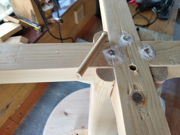 Нижняя крестовина так же, клей + шканты. Видно, что чуть выступает над торцом ножки, буквально пара мм. Так же и верхняя крестовина сделана.