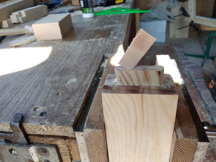 Так как одно соединение стойки получилось прослабленным, в шипе делаю продольный распил и готовлю клин, при сборке когда шип стойки будет опускаться в паз сиденья, клин будет углубляться в шип распирая его. Естественно все это на клею.