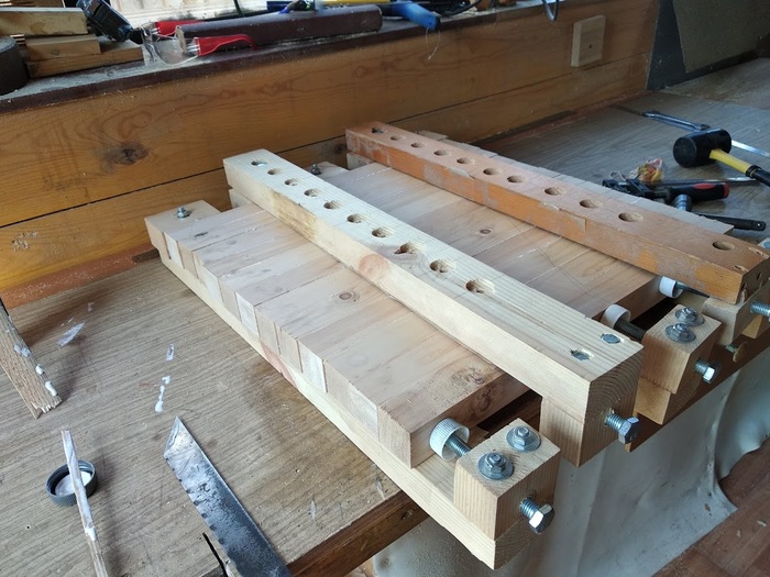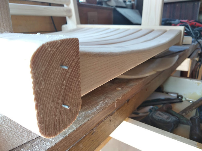 В торце сиденья расположен отдельный элемент из бруска 40*65 , повторяющий изгиб ламелей, но закрепленный на 4 круглых шканта. На фото разметка центра отверстий шкантов.