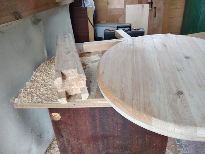 Собираю ножку. В данном случае вклеиваю верхнюю крестовину. Она гораздо меньше нижней. К столешнице будет приклеина плюс шканты.