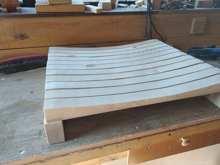 Примеряем на будущую основу, считаем сколько и на каком расстоянии надо делать пазов для крепления ламелей.