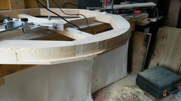 В общем, из этой доски изготовлена и закреплена на месте перилина. Башмаки основы к помосту присаморезены. Перилина так же крепится через саморезы. Все таки конструкция уличная, столярных соединений нет, на клей садить как то страшновато.