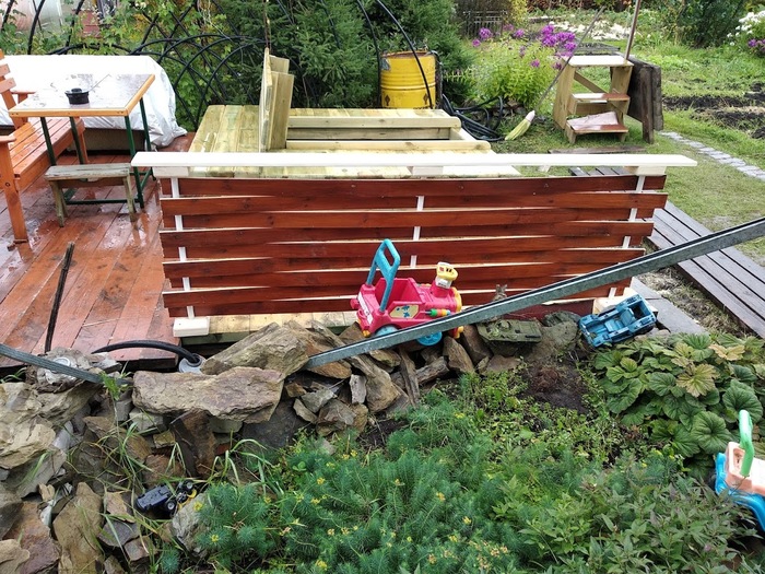 Бюджет. В моем случае все по нулям, использовались бросовые материалы, которые пошли в итоге бы в печку. До того, как вспомнили о вагонке, думал приобрести не обструганную 6-ти метровую доску 50*150, распустить часть ее на ламели шириной 5 см и толщиной около сантиметра. Из оставшихся частей сделать перилину, столбики и основу. Цена метра 50-ки 3-го сорта у нас 60 рублей, за 6 метров, отдал бы 360 рублей. Мне кажется не плохая цена за декоративную оградку длиной 2,5 метра.