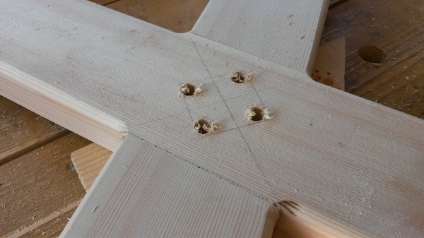 Что бы обвязка не рассохлась, места соединений снаружи усилил шкантами диаметром 8,5 мм.