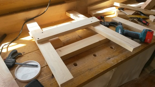 Пришло время и ножек. Их изготавливал так же, как и ранее при изготовлении табуретки https://pikabu.ru/story/prostaya_taburetka_prostyie_veshchi_... т.е. склеивал крестовину в паз из досок 20 мм. Мдя, струбцин много не бывает. В местах, которые в дальнейшем будут отпилены пришлось использовать саморезы (стянул струбциной, вогнал саморез, струбцину перенес в другое место.