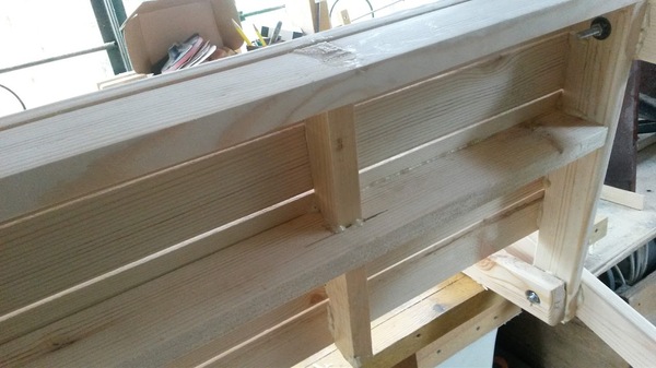 Ну и сама поперечина. Очень удобно на этой серебрянке работать шлифмашинками, и вибрации меньше и вмятены на мягкой древесине не возникают. Только переворачивать его надо, фольга марает древесину.
