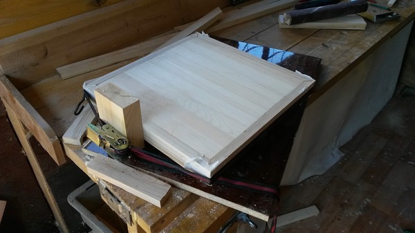 После крепления досок, так же на клей и саморезы, вклеил по две распорки. Они увеличили прочность столешницы, к ним же в дальнейшем будут крепиться ножки.