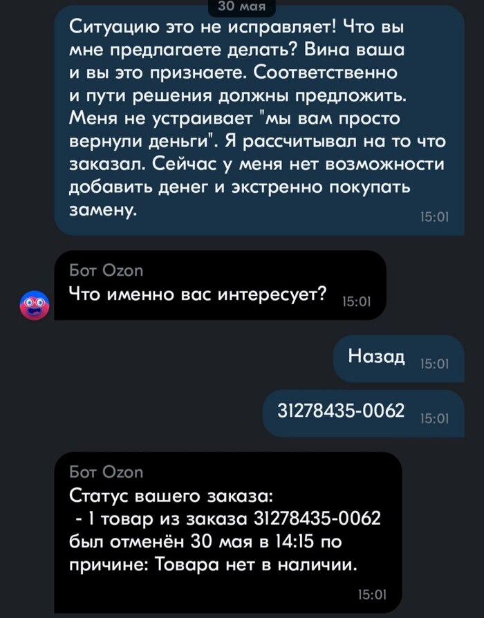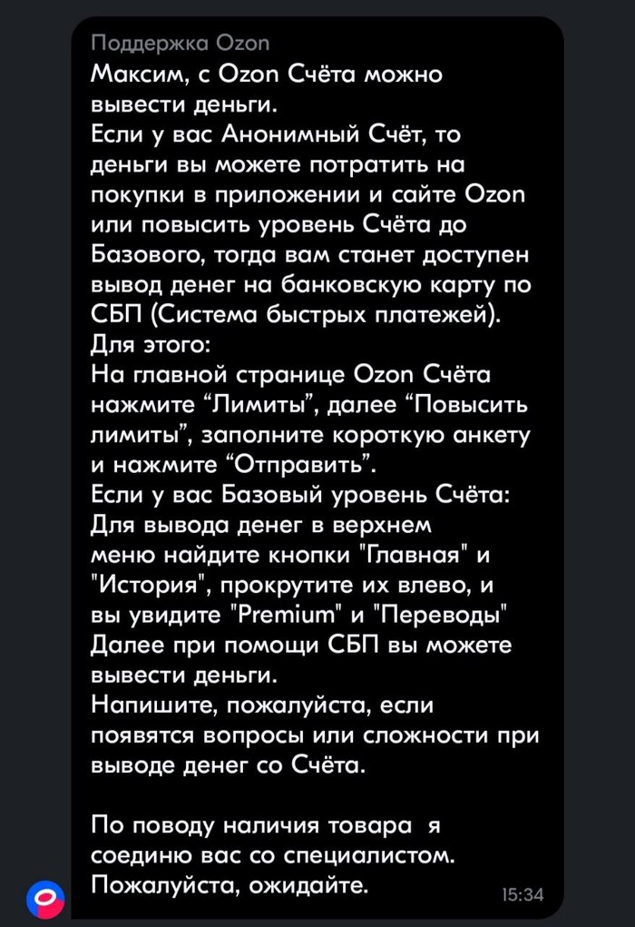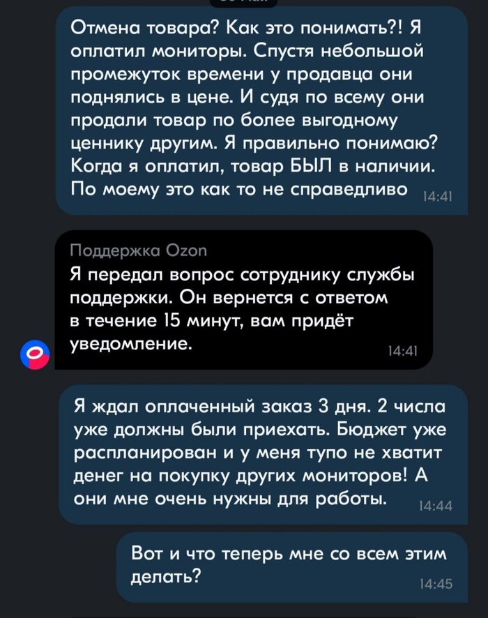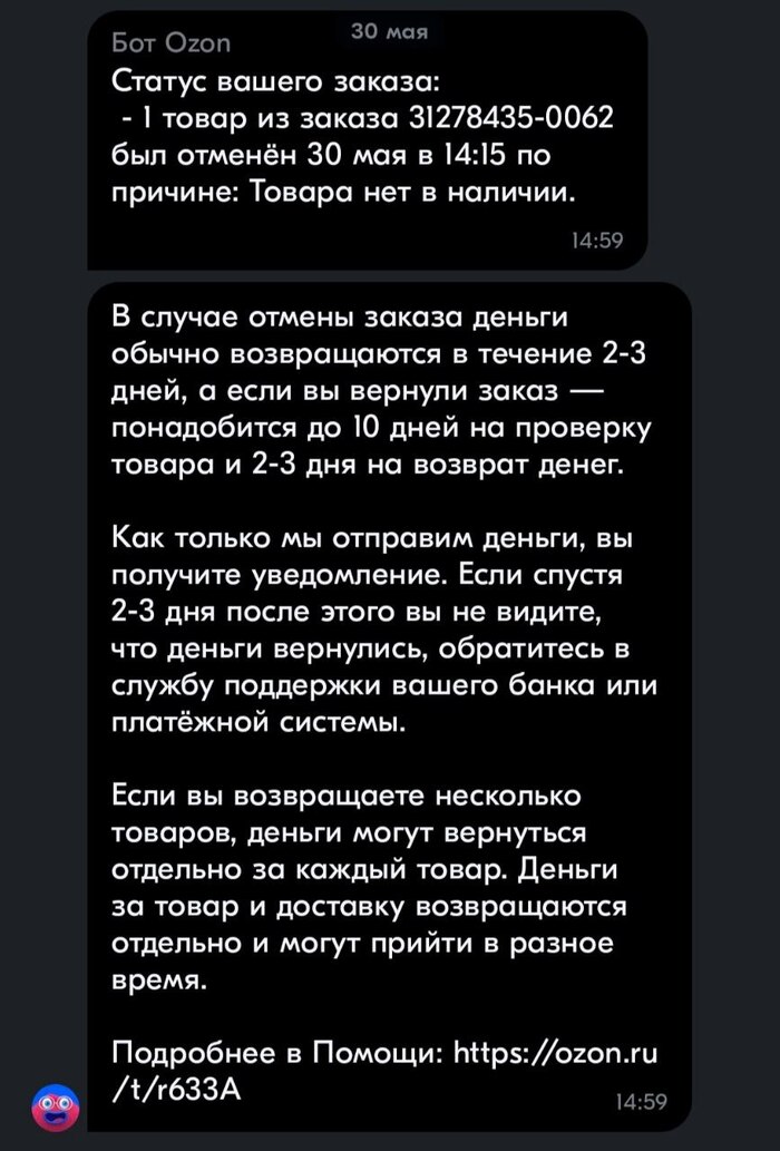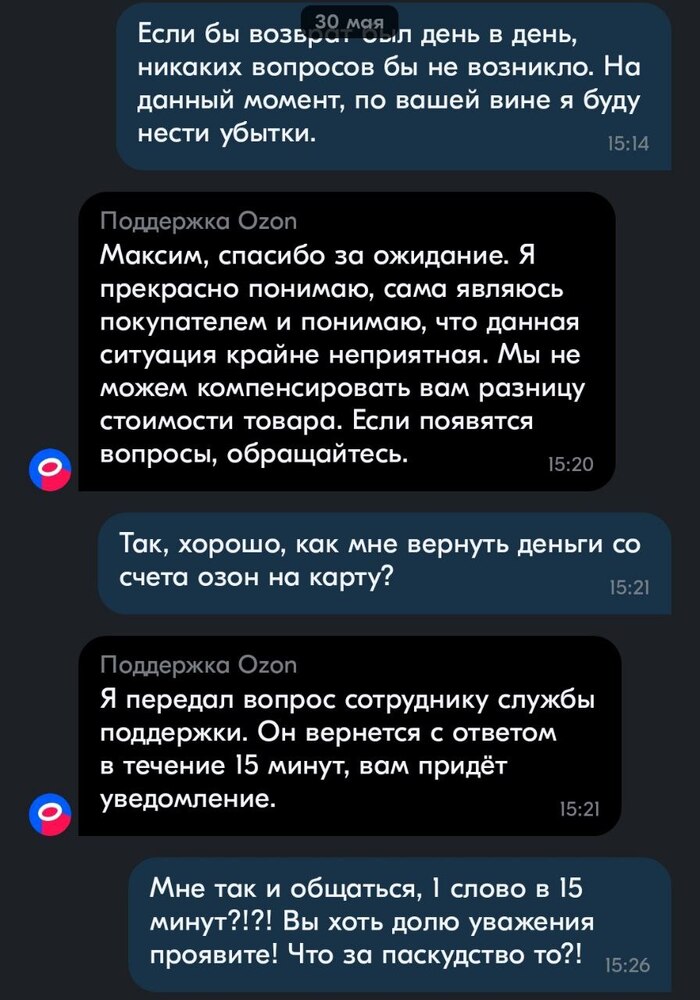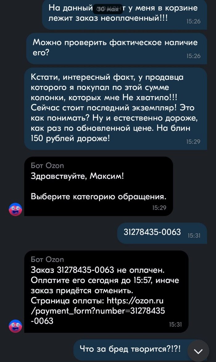 И понеслась эпопея с мудаЦЦкой поддержкой Озона. Каждый раз эти мудаки отвечали отпиской, закрывали диалог и мне к каждому сообщению нужно было выбирать товар, выбирать причину обращения, ждать от 15 минут и пытаться построить диалог.