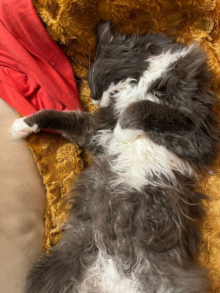 Татьяна: Вчера малыша намыла, чтобы окончательно удалить машинную грязь. Сушился на грелке и в пледе, который нам подарили в рамках проекта "Не все равно". Блох у него нет, но вот с глистами пока не понятно. Вышло немного и небольшого размера, и живот Пушка мне не очень нравится, все равно надутый. Видимо придется глистогонить еще раз.