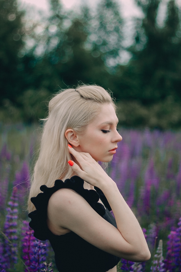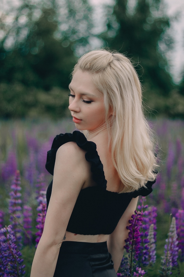 Связала в рамках теста пряжи во всех цветах. И совместила примерку топа в чёрном цвете для вас, с девчачьими фотографиями в люпинах :)