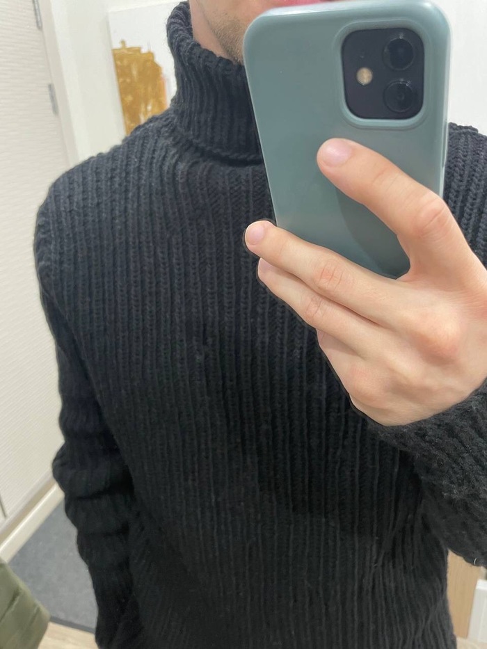 Вяжу ещё один такой свитер, светло-серого цвета, но в 58 размере. Работы - не початый край! Договорились, что он позволит мне отфотографировать примерку самой 🌝