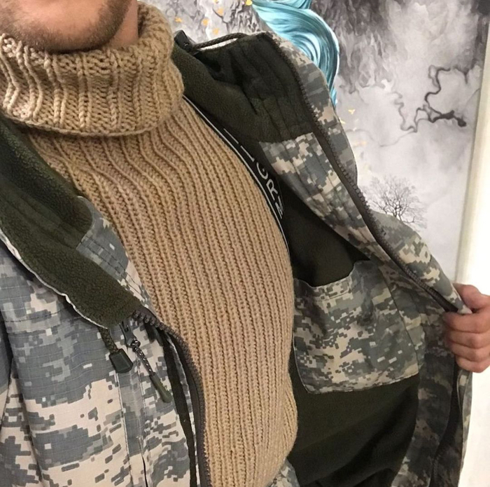 Вязала для друга свитер. Он выбрал цвет и высказал пожелания: как водолазка, простой узор, горло защитить. Дали рабочее название проекта «Свитер рыбака».