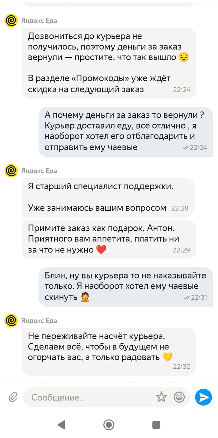В общем решил я в сей погожий денёк заказать себе шаверму Яндекс доставкой. Курьер красавчик, за 20 минут доставил мне заказ, преодолев трудности с неработающим домофоном и был таков. К сожалению кэша не было, Я поблагодарил курьера словесно и пошел ужинать, с сильным желанием накинуть ему чаевых. Зашёл я значит в приложение Яндекс еда, и не увидев кнопки "чаевые", очень удивился, ибо Яндекс её вставил даже в приложение "такси ашотик"....я решил написать в чат поддержки. Что было дальше - ниже в скринах.
