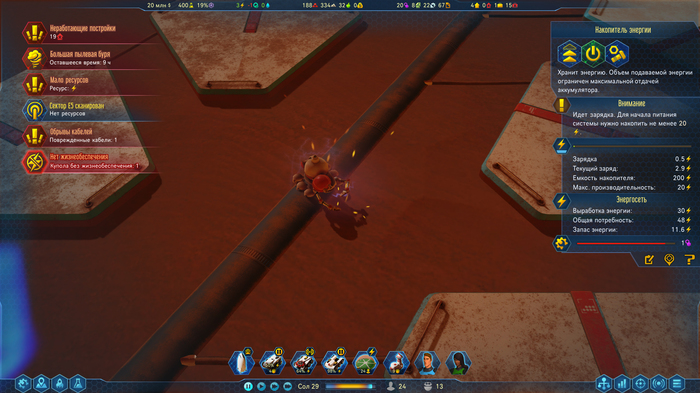 Еще удар, разрушен новенький топливный комбинат. И еще один прилетает, минус пять ветряков. Замечаю, что в кратких промежутках между ремонтными работами дроны растаскивают извлеченный из метеоритов металл по складам. Деятельные ребята, ничего не скажешь.