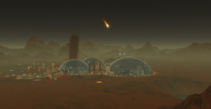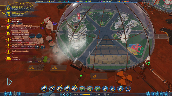 Сол 88. Начинается метеоритная бомбардировка. Она какая-то странная - обычно метеориты выпадают на одном отдельном участке, а тут летящие со страшной скоростью камни бьют сразу в двух местах, на востоке и на севере от колонии. Ну и славно, после дождика опять самоходов за металлом погоню.