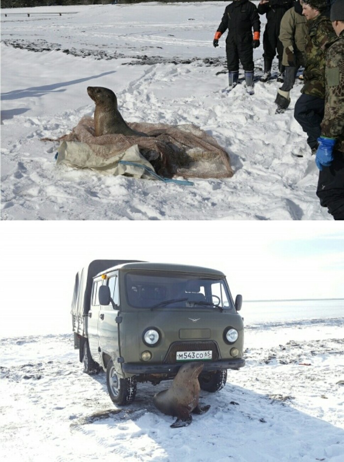 Найденному морскому льву повезло — люди перевезли его с забитого льдами охотоморского побережья Кунашира на тихоокеанское, где море свободно от дрейфующих льдов.