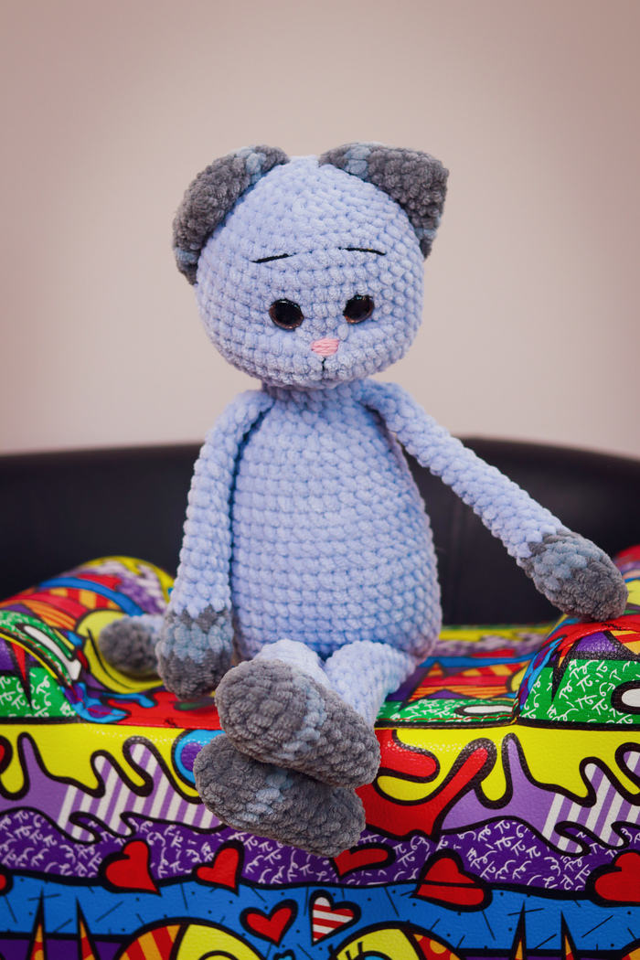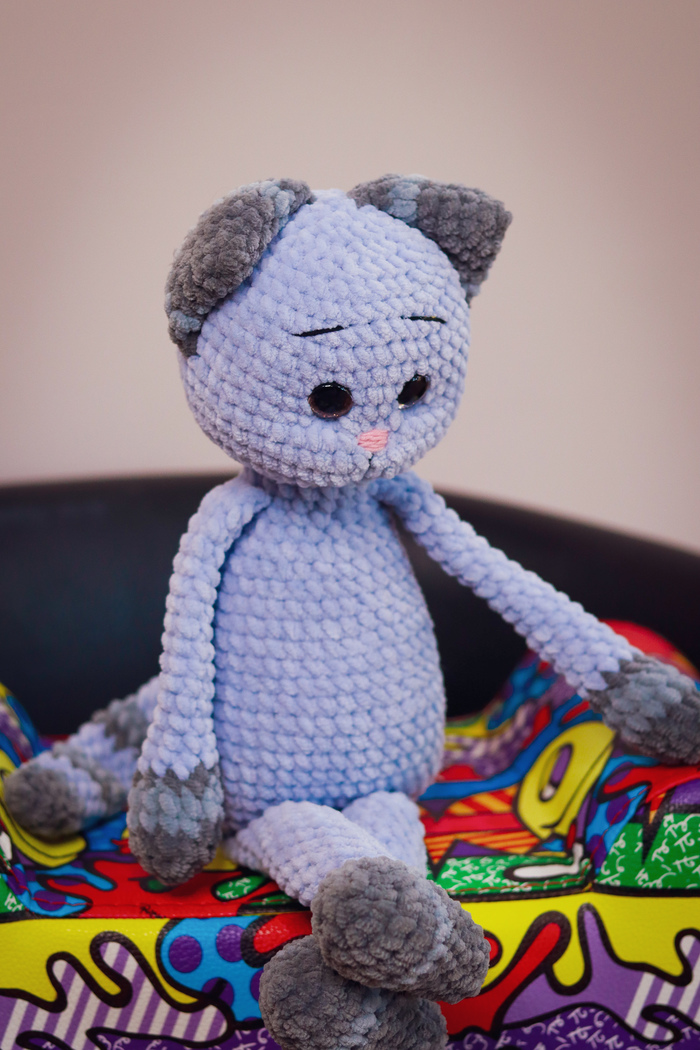 Игрушка ручной работы всегда получается с разными эмоциями. У них свой характер и настроение, потому что мастер вкладывает частичку своей души. И самое важно, если связать второго такого кота, он получится абсолютно в другом настроении.
