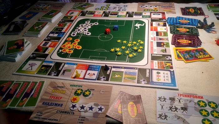 Все, кто видел игру, без исключений воспринимают её как «очередную Монополию на тему футбола». Виной тому схематика игрового поля, совпадающая со схемой Монополии на 100%, и даже элементы оформления поля. Я специально даже клеточки пересчитал. =) Поле, фишки, два кубика, деньги, карты….Монополия? Да, есть необычные планшеты, звёздочки, карты результатов матча, но впечатлений не меняет. Отсюда первое пожелание - отказаться от лёгких путей оформления под кальку.