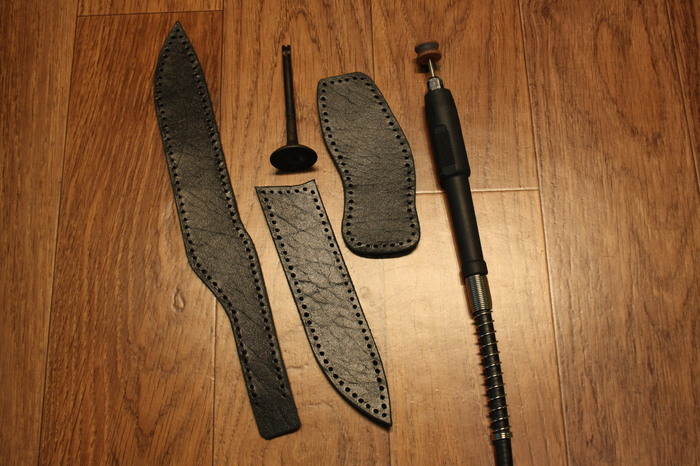 После на этих деталях делаю декоративную прошивку седельным швом. Нить использую плоскую вощеную dafna черного цвета. Раньше использовал более светлые, но многие люди используют ножны по прямому назначению и нить становиться неприятно грязной, а в черном исполнении этого незаметно, а так же при некотором износе и царапинах на коже для легкой ретуши всегда можно использовать обычные обувной крем черного цвета, который вернет частично товарный вид, а так же закроет доступ воде в местах порезов и царапин на коже.