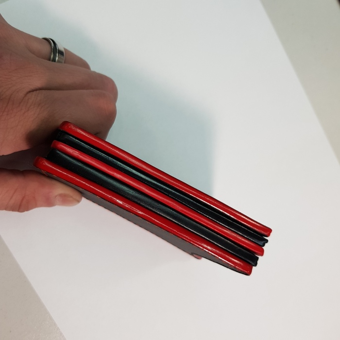 Следом сшиваю все части воедино, стараясь как можно точнее выдержать плоскость и если есть большие несостыковки ровняю бритвой и наждачной бумагой. И настает самый медитативный процесс в создании данных ножен, это полировка широкой площади уреза состоящего из трех слоев кожи каждый из которых имеет среднюю толщину в 4 мм. Самого процесса фотографировать не стал. Ограничился фотографиями результатов несколькочасового труда. Первое фото без нанесения краски, на нем видно все три слоя кожи. Второе фото с нанесенной краской. Третье фото урезов трех ножен рядом для показа разницы его вида под разным углом освещения.