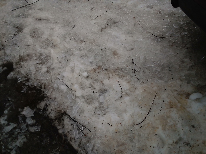 А вот этот самый "ледяной панцирь" в битом состоянии. Осыпался, когда автолюбители оттаскивали с дороги мешающие ветки (и такие "кучки" также повсюду):