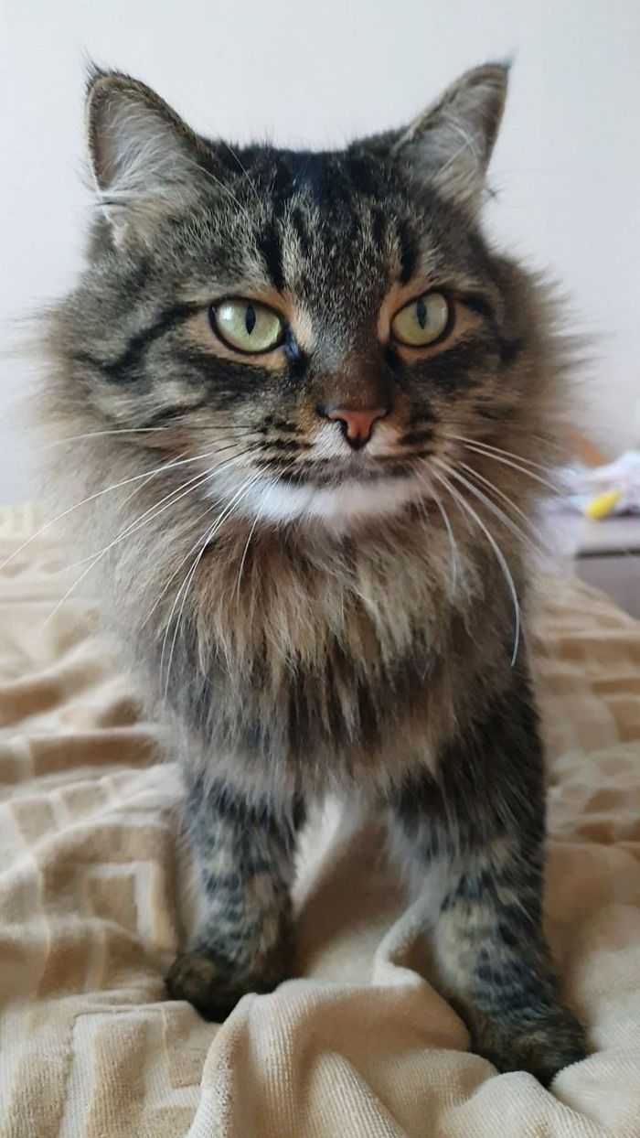 Окрас черно-серый, пушистый. Размера среднего, 3-4 кг. Взрослый - 3,5 года.