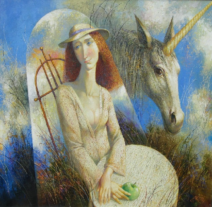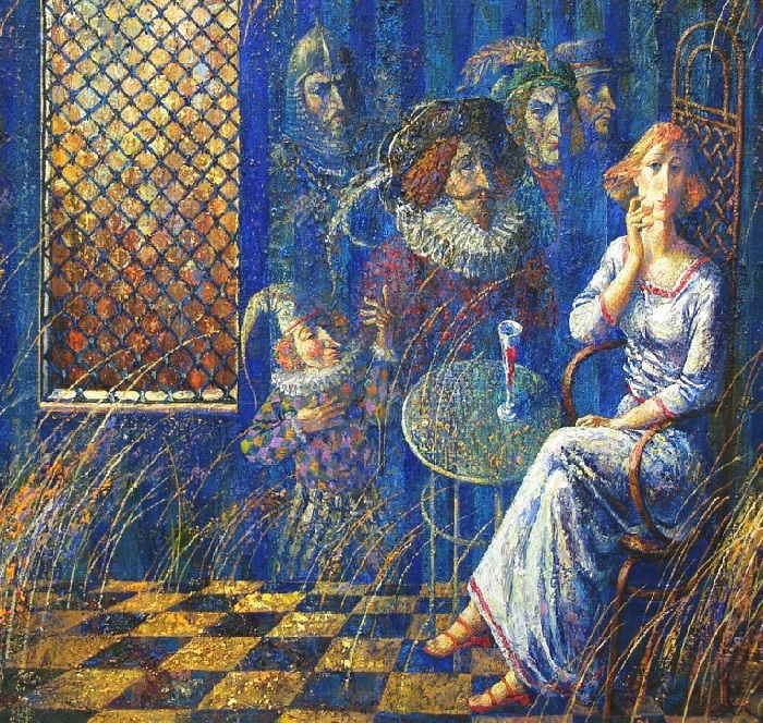 Мифологические и исторические персонажи убедительно сосуществуют на холстах художника с современными типажами и образуют единый образный мир.