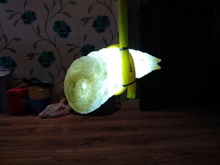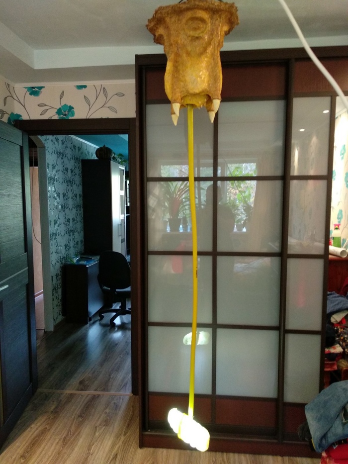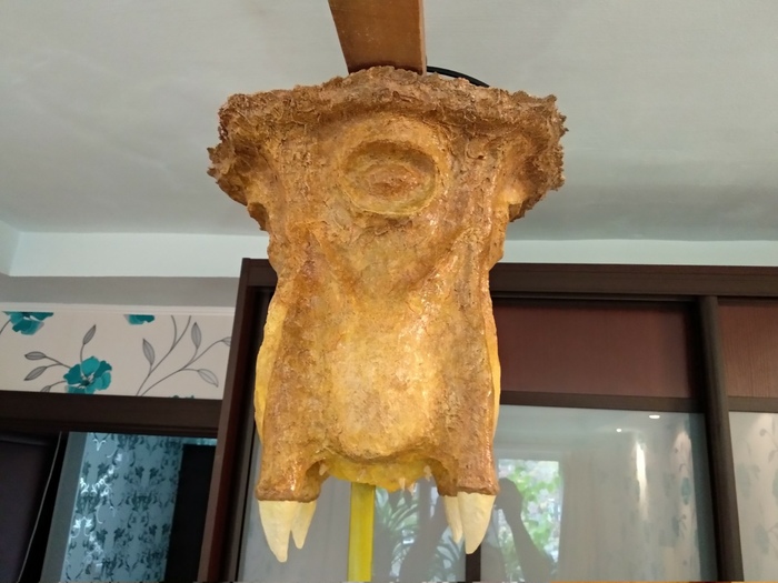 Итак, нашел как-то статью, где один человек поэтапно делал ночник из папье-маше в виде монстра из игры Half life, и очень загорелся идеей сделать своего Барнакла. Вооружившись картоном, кучей газет и клеем ПВА, я приступил к работе. Из опыта у меня за плечами была чашка из клейстера и бумаги, которую я делал еще в начальной школе на трудах в конце 90х годов. И вот, спустя пару недель импровизации, получилась бумажная болванка, которую я зашкурил наждачной бумагой и покрыл белым грунтом, дабы буквы от газет не проглядывали через краску. А затем был первый опыт работы с акриловыми красками (да и, в принципе, с красками). Это был самый сложный этап в моральном смысле, надо было пересилить себя и нанести на это чудо уже хоть что-то, а после исходить из получившегося. Наносил краску куском поролона, кое где использовал тонкую кисть. Очень увлекся процессом и не заметил, как получил даже больше, чем хотел. Затем, покрыл зверя лаком для мебели (он слегка дал желтоватый оттенок, но было не критично).