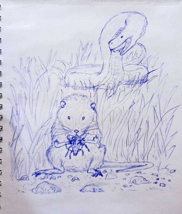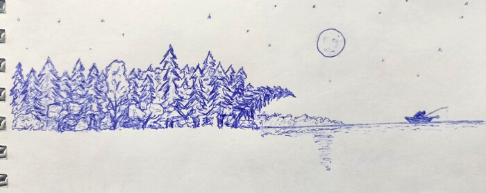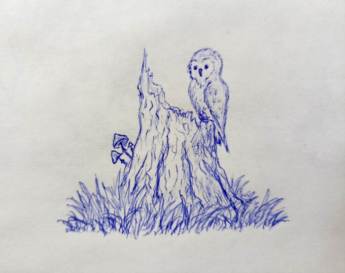 При себе только блокнот и ручка, что мне вручили там как презент. Так вот, спустя некоторое время изнасилования бумаги ручкой в надежде что из стержня польётся долгожданная жидкость...мда...так вот, о чем я? А, да, решил я порисовать. К моему удивлению, глаза перестали слипаться, и обо сне я больше не думал. Видать поэтому в далеком прошлом я очень часто на уроках прикладывался к карандашу, так сказать)