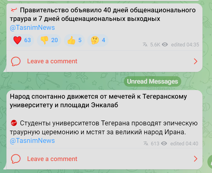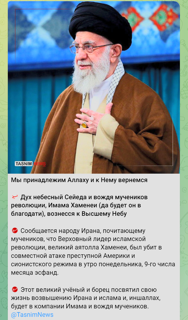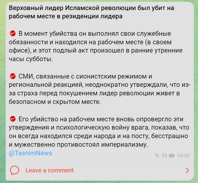Один из лидеров протеста Мохаммад Фарук Инклаби назвал убийство Хаменеи "крайне прискорбным и опасным для глобального мира". "Нападение на руководство суверенного государства противоречит международным нормам и может иметь серьезные последствия для региональной и глобальной стабильности", - сказал он.