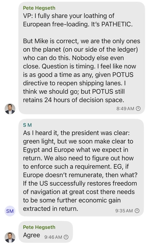 8:49 Пит Хегсет Вице-президент: Я полностью разделяю ваше отвращение к европейской бесплатной загрузке. Это ТРОГАТЕЛЬНО. Но Майк прав, мы единственные на планете (с нашей стороны бухгалтерской книги). кто может это сделать? Больше никого даже близко не было. Вопрос в сроках. Я считаю, что сейчас самое подходящее время, учитывая директиву президента о возобновлении судоходства. Я думаю, нам пора отправляться, но у президента все еще есть 24 часа на принятие решения.