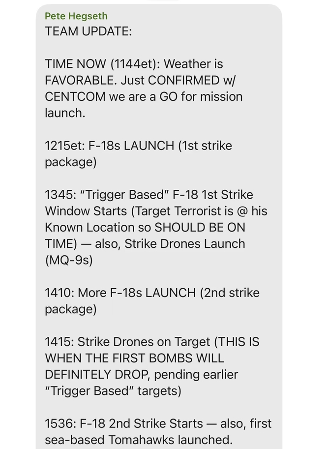 Текст под этим начинался так: «ТЕПЕРЬ (1144et): Погода БЛАГОПРИЯТНАЯ. Только что ПОДТВЕРЖДЕНО CENTCOM, что мы готовы к запуску миссии». Centcom, или Центральное командование, является боевым командованием вооруженных сил на Ближнем Востоке. Текст в Hegseth продолжается: