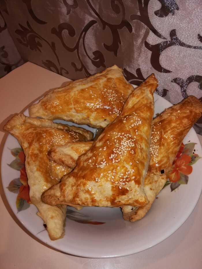 Квадраты теста разморозил, разрезал на треугольники и раскатал. Положил начинку, залепил, сверху помазал желтком и посыпал кунжутом. Потом в духовку на 30 мин. Получилось две партии по 8 шт. Пока пеклась вторая первую мы съели.