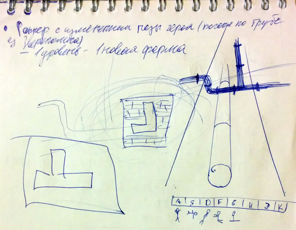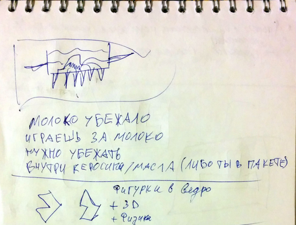 Итак, конкурс начинается в субботу, в 7 часов утра по Омскому времени. Всё из-за разницы часовых поясов, поскольку в это время объявляют тему, на которую нужно будет писать игру. Тема этого Ludum Dare - Shape Shifter, то есть оборотень. Мы лениво подтягиваемся к лофту, попутно обдумывая различные идеи игр. Идей - хоть отбавляй, но чем дольше идут споры, тем меньше становится вероятность сойтись на чём-то одном. К 10 часам утра блокнот изрисован подобными концептами, каждый из которых чем-то не понравился кому-то из команды: