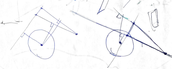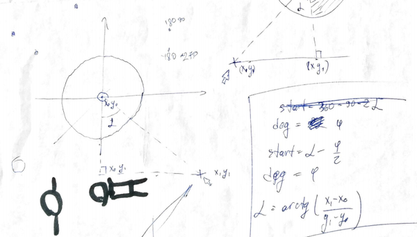 Игру мы писали не на какой-то новомодной Unity, а на скромном 2d-движке libGDX, в котором многие вещи приходится делать самостоятельно. В частности, для отрисовки теней, для проверки того, попал ли охотник выстрелом в волка, укусил ли волк охотника и не врезался ли кто-то из персонажей в дерево, приходилось вспоминать школьные уроки тригонометрии и обсчитывать кучу математики. Куда сдвинуть окружность на минимальное расстояние, чтобы она перестала пересекаться с данной? Как найти координаты точек касания по координатам центра окружности, радиусу и координатам точки, из которой выходят касательные? Как понять, пересекается ли с окружностью треугольник? Как найти угол между осью OX и прямой, соединяющей две точки? Вот к таким забавным геометрическим задачам сводилось написание игрового движка. Соответственно, блокнот пестрил подобными рисунками: