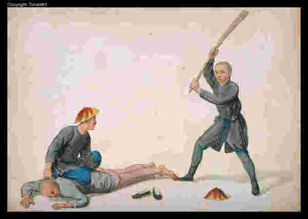 Наказание преступника методом лупления по пяткам.Китай, Холст, Краски, Дубина