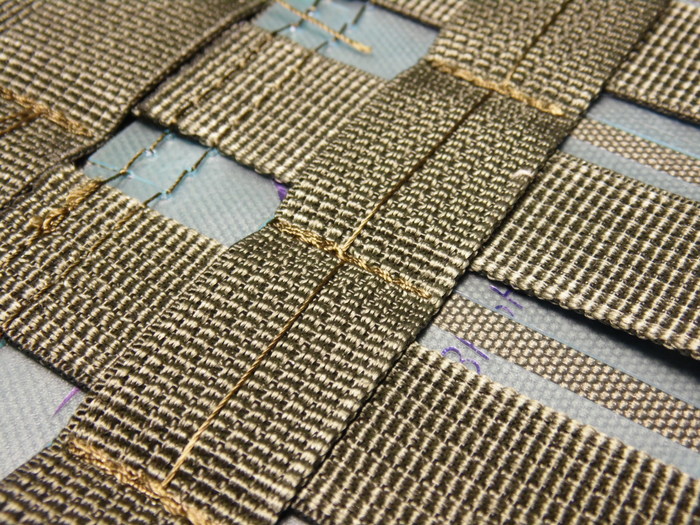 Оптимизация. Упрощать желательно все, что может быть упрощено. Результатом таких действий порой становятся приспособы, как на фото ниже. В данном случае пришиваются стропы для крепления подсумков и прочего навесного. Используется стандарт molle (есть аналоги alice и pals). И чтобы каждый раз не отмерять промежутки, пришлось немного подвигать извилинами. Зато теперь пришить очередную стропу проще простого.