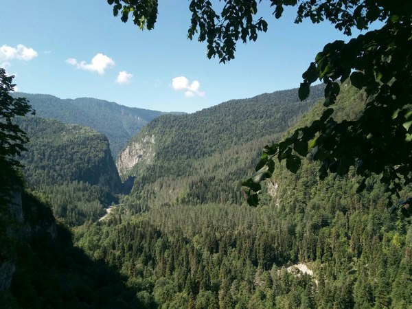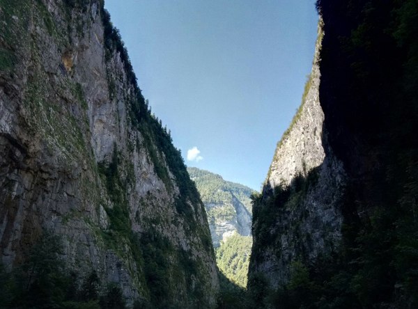 Вскоре мы очутились в огромном ущелье под названием «Каменный мешок». Это две отвесные скалы, образующие замкнутое пространство. Когда ты стоишь в этой красоте, то душа наполняется каким-то необъяснимыми ощущениями. Возникает чувство восхищения природными творениями, и параллельно с этим появляются мысли, как же мал человек в этом мире! Никакие дорогие тачки, ни золотые унитазы, ни огромные деньги не смогут сравниться с теми богатствами, какие есть у матушки-природы.
