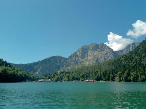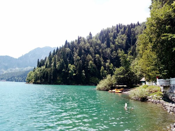 Далее наша дорога следовала через смотровую площадку и водопад «Мужские слезы». Вскоре мы добрались до потрясающего озера Рица. Со смотровой площадки открывался изумительный вид на горы, которые были частично покрыты снегом. Но такого зрелища нам оказалось мало, и мы решили покататься на катамаране и полюбоваться этими живописными видами с воды. Мы были в восторге, потому что с самого озеро все великолепие, которое его окружало сверху, открылось совершенно с другой стороны. Мы увидели скалу, которая очень сильно напоминает гору Рашмор известную в США тем, что на ней имеется огромный барельеф, содержащий портреты четырех президентов.