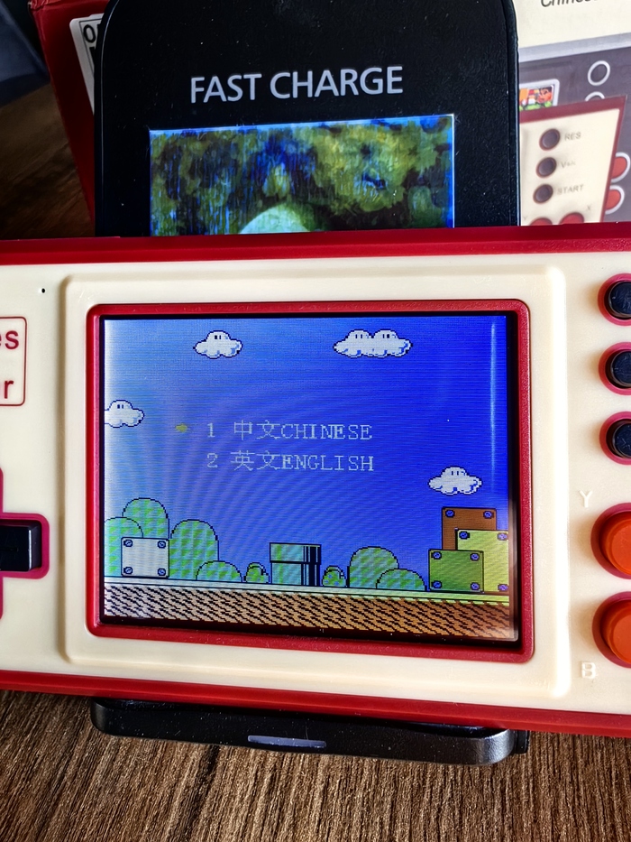 При включении видим выбор из 2 языков - китайского и английского. К слову, при нажатии кнопки Resrt в игре, снова попадаем в меню выбора языка. В комплекте заявлено 500 игр, меню чем-то похоже на китайскую многоигровку для Денди. Прошивки, как таковой, нет, записать что-то допом нельзя. Сами игры переименованы дичайшим образом, но понять что и где реально. Разумеется очень много повторов, но основные тайтлы присутствуют - Черепахи, Чип и Дейл, Марио и др.