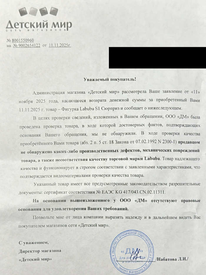 Недавно я приобрёл фигурку Labubu по цене 1999 руб. На тот момент я ещё не знал, что настоящие оригинальные Labubu стоят в два раза дороже, и был уверен, что сеть «Детский мир» реализует только подлинный и сертифицированный товар.