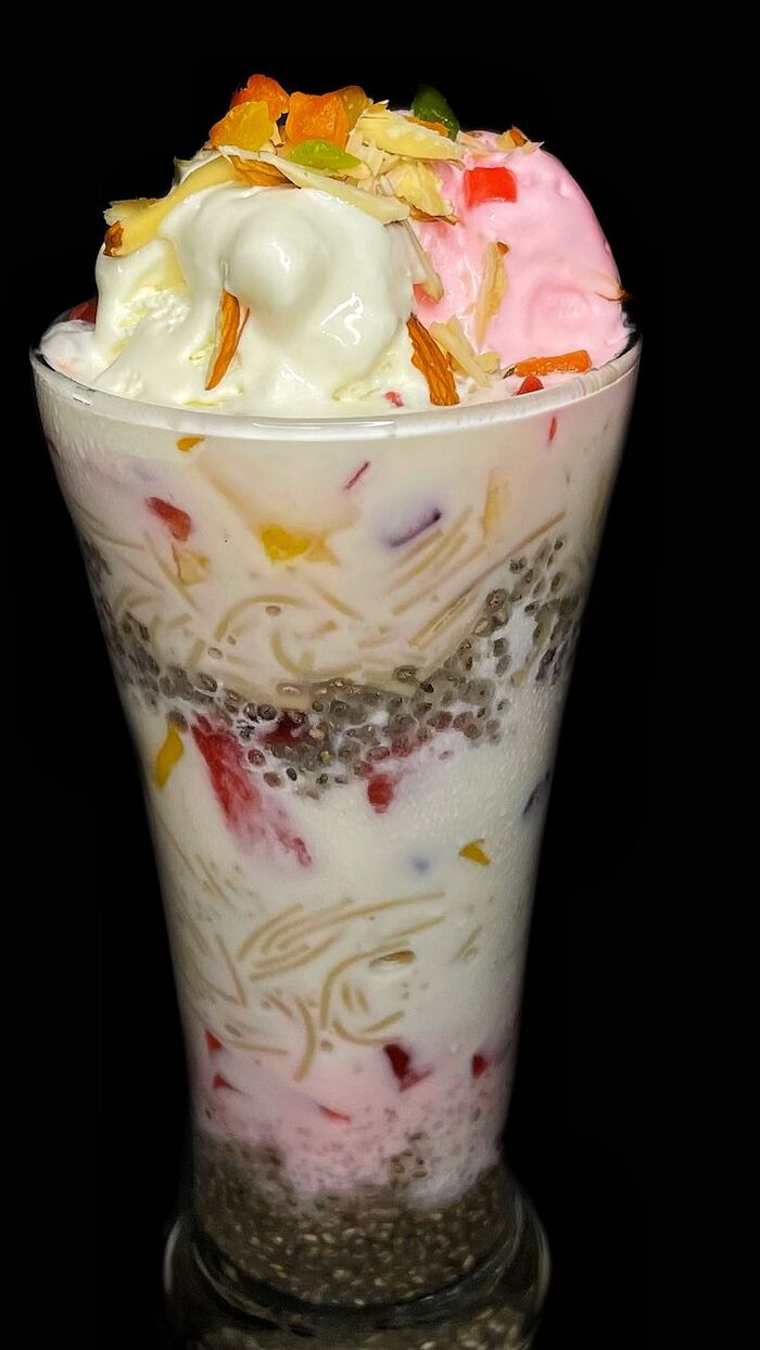 И очень странный десерт - Фалуда. Это мороженное с крахмальной вермишелью. Также в него добавляют семечки базилика, сгущёнку, сироп из розы, орехи и сухофрукты. Я не оценила. По моему, странная комбинация.