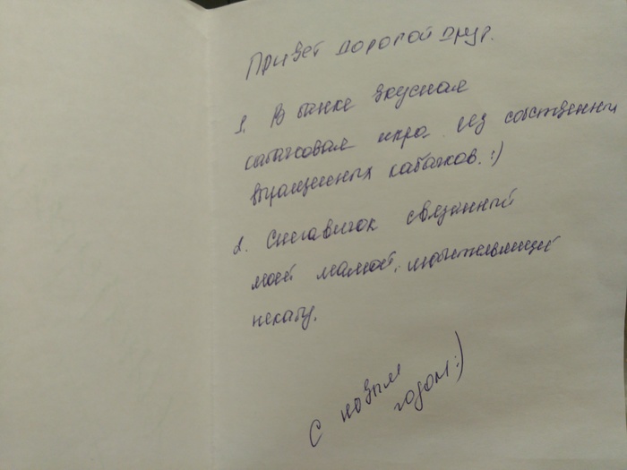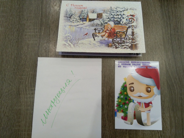 Когда визуальный осмотр был завершён, первым делом руки потянулись конечно же к открытке, ведь я ожидала там увидеть послание от своего Деда Мороза, и не ошиблась.