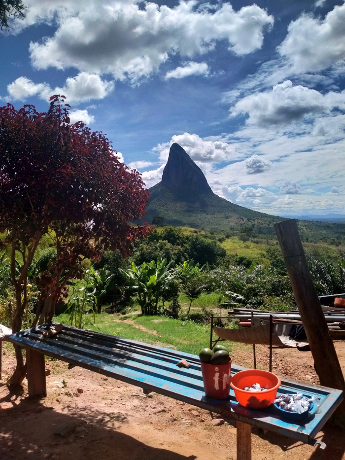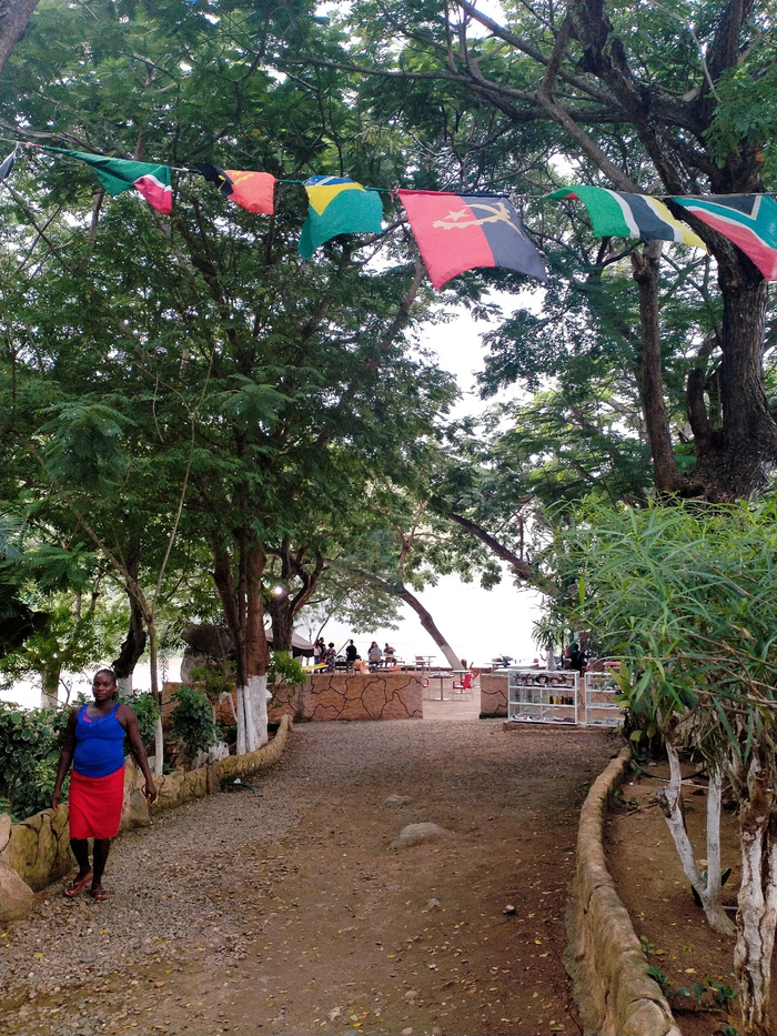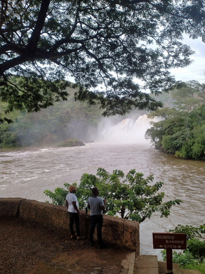 Возвращались домой другим маршрутом. Рядом с Бенгелой расположен городок Лобиту. Проезжая его, издалека видели много фламинго. Ехали через провинцию Южная Кванза (мы живём в Северной Кванзе). Недалеко от г. Сумбе остановились посмотреть на водопады Бинга (As cachoeiras de Binga). Это туристическое место. Здесь есть кафе, продают сувениры, немного в отдалении стоят столики для пикника. На плакате сказано, что здесь можно поплавать на лодке, устроить посиделки у костра, организовать кемпинг, есть пешие прогулки. Также здесь можно провести свое мероприятие. На берегу стояла табличка, что купаться запрещено. За вход мы заплатили 300 кванз. На входе висят флаги тех стран, откуда чаще всего сюда приезжали туристы (на фотографии не все флаги). У нас тоже спросили национальности, записали. Интересно, был ли здесь ещё кто-нибудь из России. Может, в далёком будущем здесь и флаг России будет развеваться 🤔