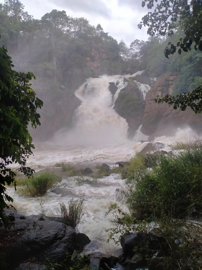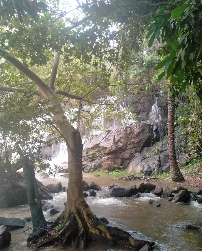Мы пошли по тропинке через лес ближе к дальним водопадам. Там местные парни ловили рыбу, готовили ее тут же на костре. А ещё один из них показал нам, что за потоком воды в водопаде есть скрытая пещера, но мы уже не полезли в воду. Река называется Куву-Кеве. Ее протяженность 505 км, впадает в океан. Это не единственные водопады на этой реке. Есть и другие, некоторые с небольшими пляжами. Красивые пейзажи.